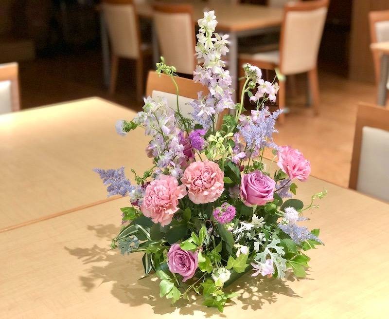 こちらは、昨年からレッスンを継続されている生徒さんの、5月に制作されたコーンシェイプのアレンジメントです。可愛らしいピンク系に淡紫色のお花で、ふんわりと優しい印象に仕上がっていますね!基本の形をしっかりと押さえつつ、お花の色合わせや配置にも個性が光ります✨