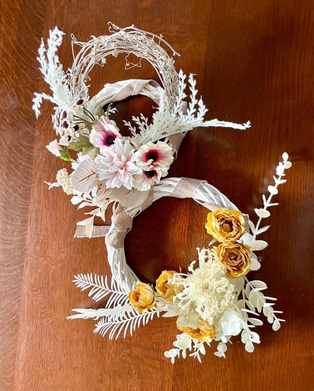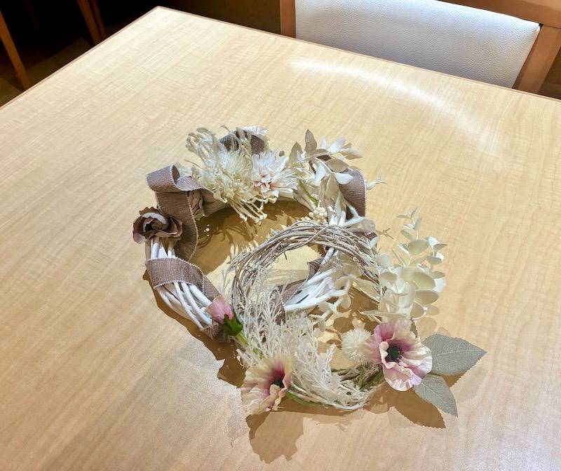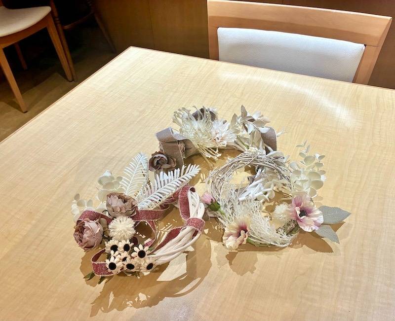 例えば、大小のリースを重ねて奥行きを出したり、リボンで繋いで流れるようなデザインにしたりと、アイデア次第で組み合わせは無限大!生徒さんたちは、それぞれのリースの素材や色合いを活かしながら、何度も配置を変え、一番しっくりくるバランスを探していました。