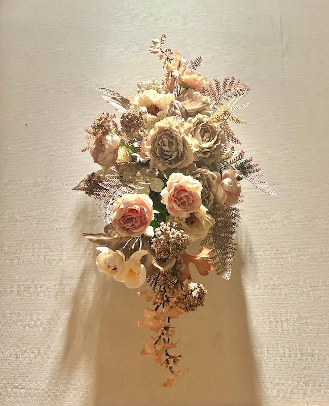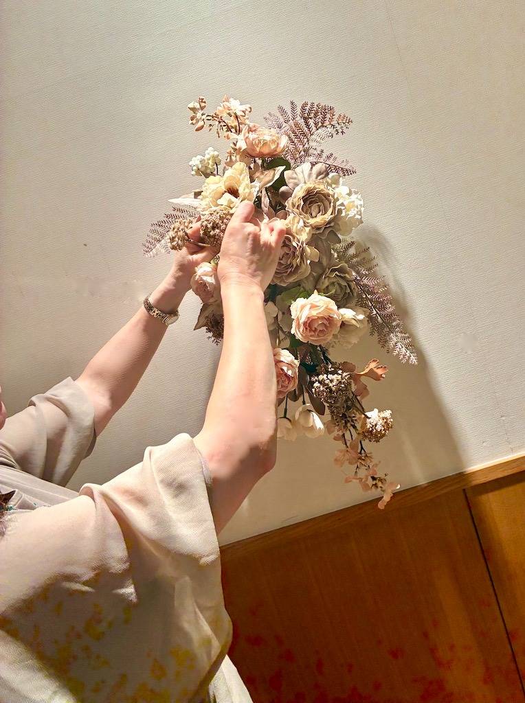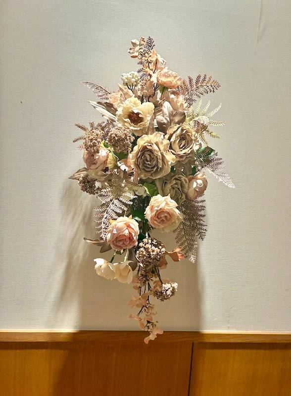 今回は、事前に壁面に土台を設置した状態でアレンジメントを開始。生徒さんたちは、完成形をイメージしながら、まるで絵を描くように花材を配置していきます。ピンクベージュやモーブ、オフホワイトといった優しい色合いのバラや芍薬をメインに、繊細な葉物や小花をバランスよく配置。流れるようなラインや、奥行きのあるグラデーションが表現され、壁一面が華やかなアート空間へと変貌を遂げました。