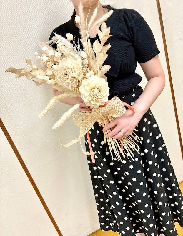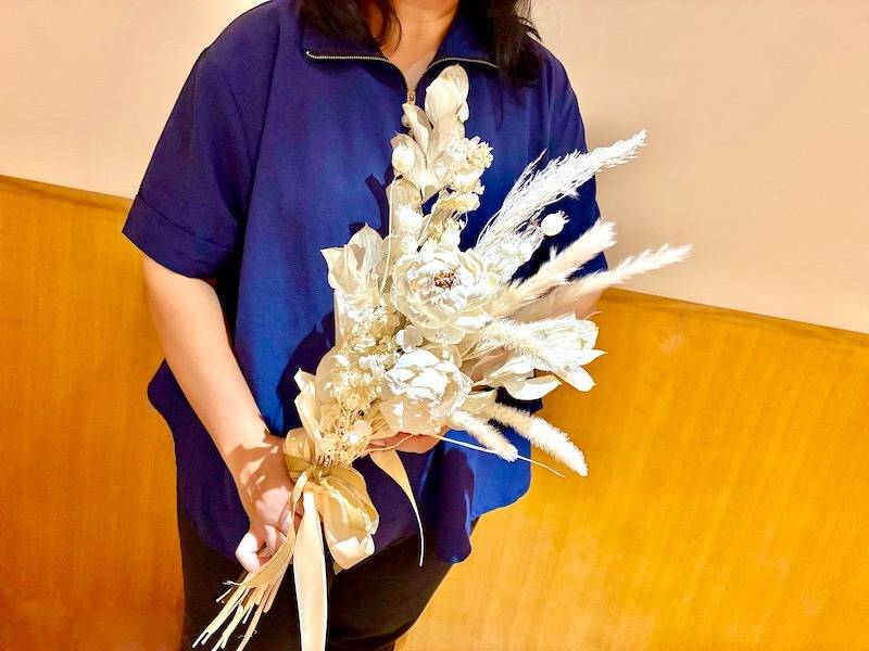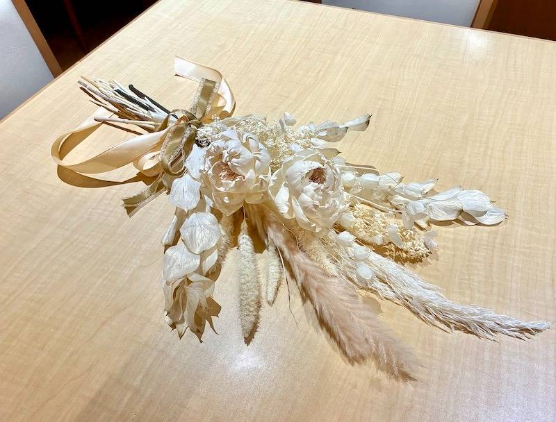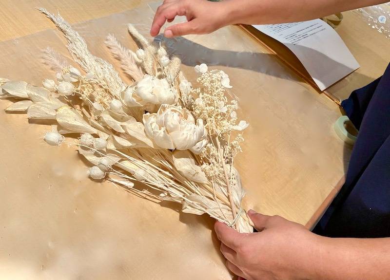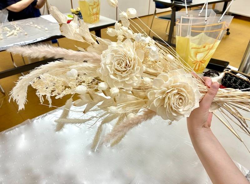 このように今回のレッスンでは、ふんわりとした優しい佇まいが魅力のパンパスグラスを主役に、ナチュラルでありながらも洗練された大人の女性にぴったりのブーケを制作しました。