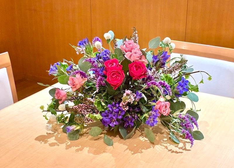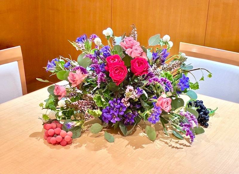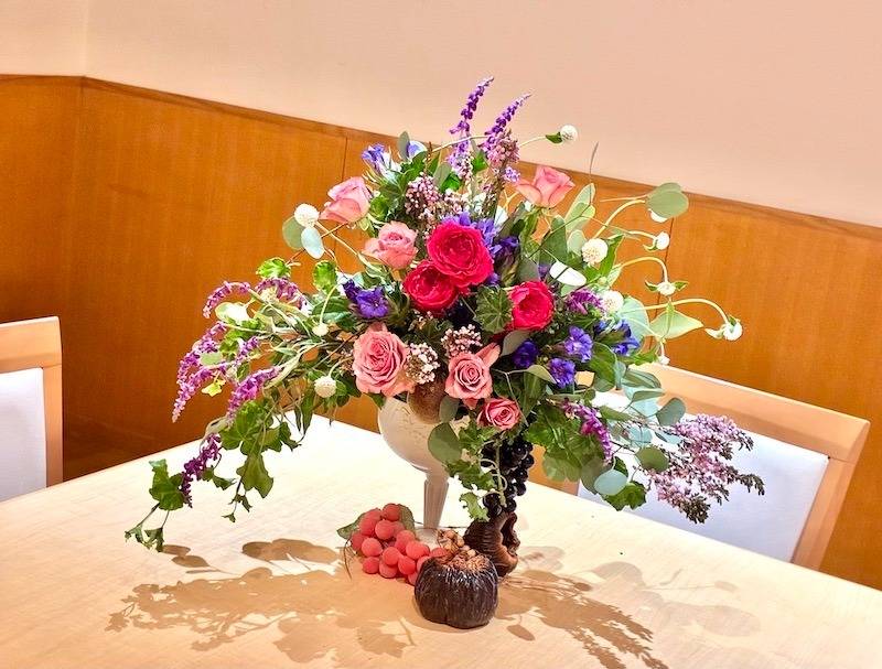 深みのあるレッドやピンクのローズをはじめ、青いリンドウ、紫のセージなど、秋の深まりを感じさせる濃色と、カントリーサイドの素朴さを感じさせるフィラフラワー素材を組み合わせることで、「暖かみ」と「豪華さ」を両立。完成イメージは「まるで西洋絵画のような重厚感」な生徒さんたちの作品をご覧ください!