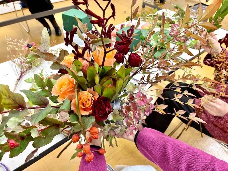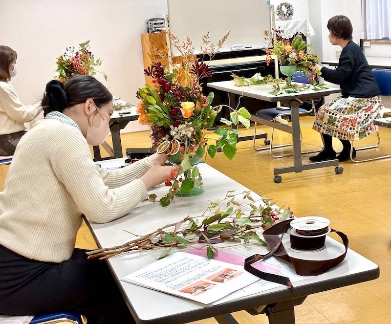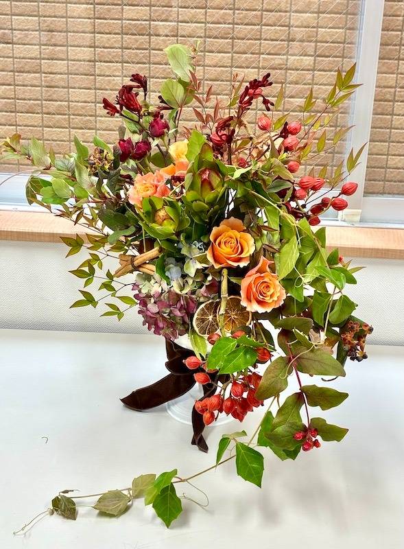 同じ花材、同じ器を使っても、生徒さん一人ひとりの感性で、実の垂れ方やバラの配置に個性が出て、それぞれの「私だけの収穫祭」が表現されていましたね。
