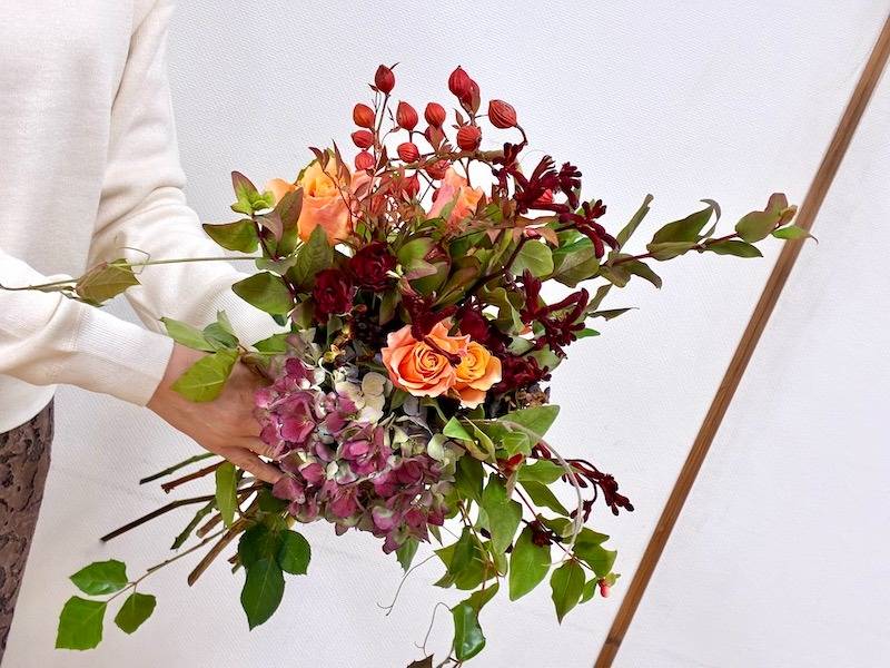 使用した主な花材:バラ(テラコッタ系)、スプレーバラ、秋色アジサイ、カンガルーポー
