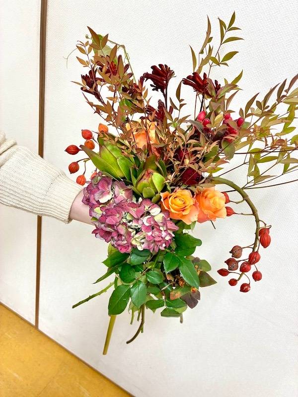 カラーコーディネートは、流行のテラコッタ色(赤褐色)をメインに。シックな色合いのバラやスプレーバラをポイントに、秋色アジサイ(くすみカラー)や、ポイントとなるリュウカデンドロンのユニークな質感で深みを加えました。