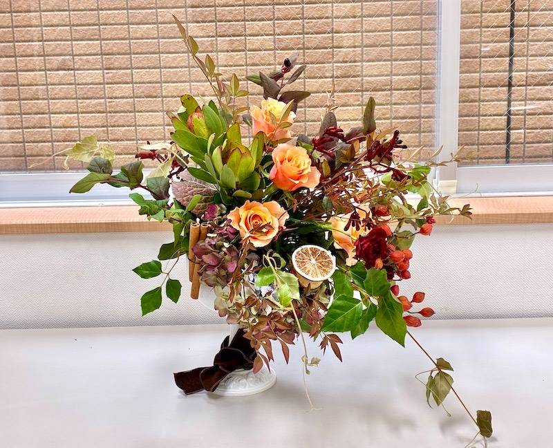 教室に入った瞬間、「わぁ、なんだか温かい香りがする…!」と、生徒さんたちが口々に仰っていました。それもそのはず。今回のレッスンでは、目に入る美しい花だけでなく、シナモンスティックやドライオレンジをアレンジに組み込むことで、嗅覚からも「収穫祭」の温もりを感じていただくアロマハーベストの演出を取り入れたんです。このスパイスの香りが、深まる秋のシックな雰囲気を一気に引き上げてくれました。