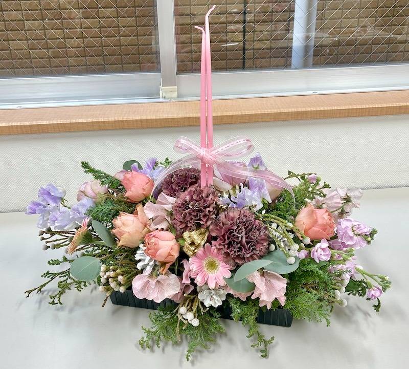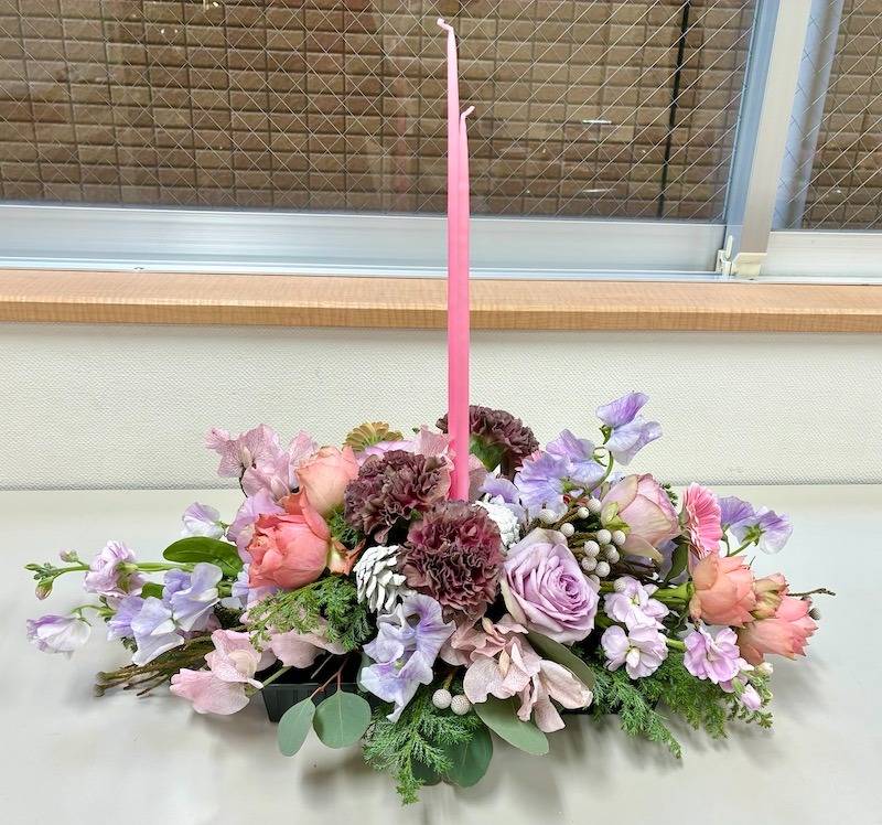 今回、花材は優しくエレガントなピンク~ラベンダー系のジェムカラーをメインに採用しました。