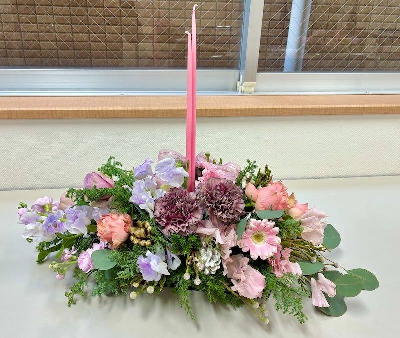 - 可愛らしいピンクのキャンドルと、白塗布の松笠や軽めの金色ラメリボンを添えて、華やかなクリスマスの雰囲気を演出しました。皆さんの作品(写真左側)を見ると、キャンドルが立ち上がり、冬の祝祭感に溢れていますね。
