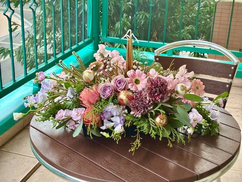 このシンプルな切り替えで、お正月は「和の気品を纏ったジェムカラーのアレンジ」に早変わりします。欧米では1月6日の公現祭までクリスマス装飾を楽しむ習慣がありますが、このアレンジなら、大晦日まではクリスマス、年明けからはお正月として、長く楽しめそうですね!
