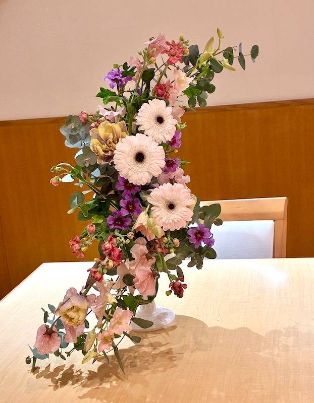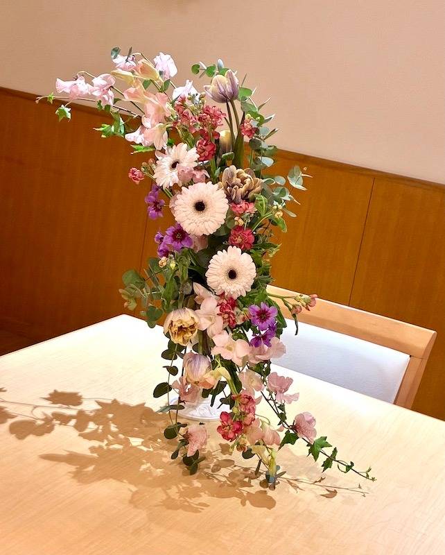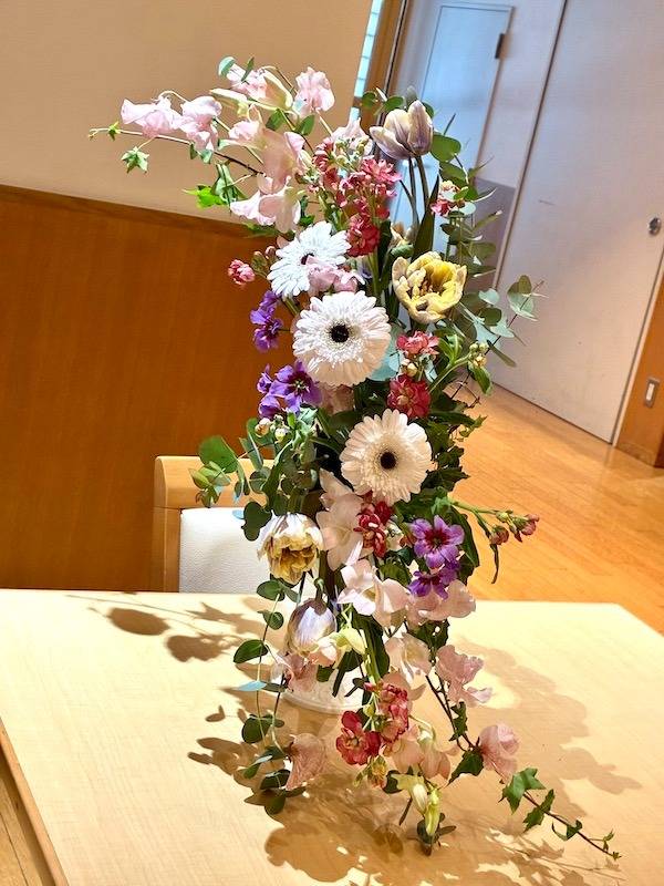 出来上がった作品を並べてみると、まるでドレスを纏った貴婦人が優雅に会釈をしているような、気品あふれる姿が完成しました。言葉や文化が違っても、「美しい」と感じる心はひとつ。お花を通じて心が通じ合う、講師冥利に尽きる瞬間でした。