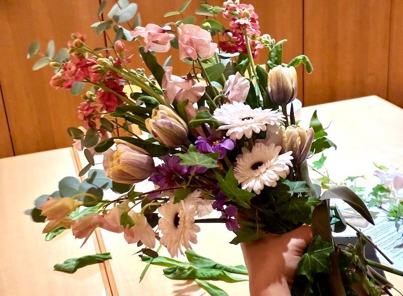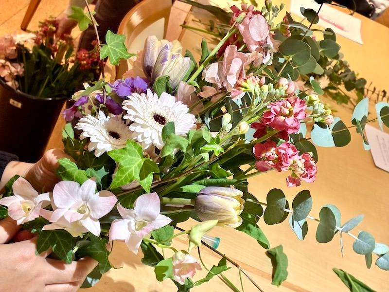 生徒の皆さんは、ユーカリやストックの茎の曲がり具合をじっくりと観察し、フォームに挿す前に優しく「◯◯◯」作業からスタート。指先の感覚を研ぎ澄ませてお花と対話する時間は、日常の忙しさを忘れさせてくれる、マインドフルネスなひとときとなりました。